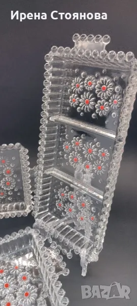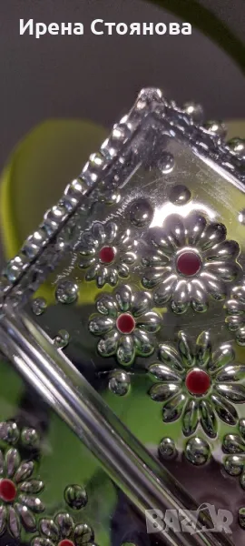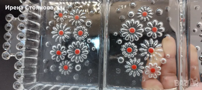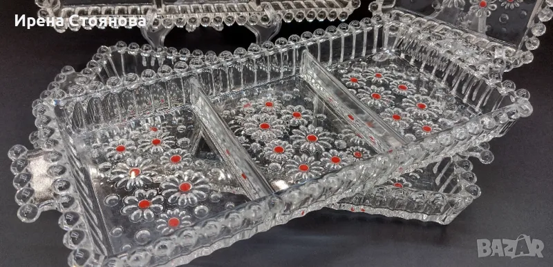 Walther Glas, серия Fabiola. Правоъгълно плато за сервиране с 3 разделения 34/15 см и височина 3,5 см. Прозрачно кристално стъкло, удобни дръжки за захващане, борд с бобчета и релефни цветя с акцент от коралово червено. Налични са 4 броя. 2 броя с минимални, незабележими следи, цена за брой 38 лв. 1 брой с леки следи от употреба/съхранение от долната страна, цена 30 лв. 1 брой с леки захабяване в едно разделение, цена 28 лв.