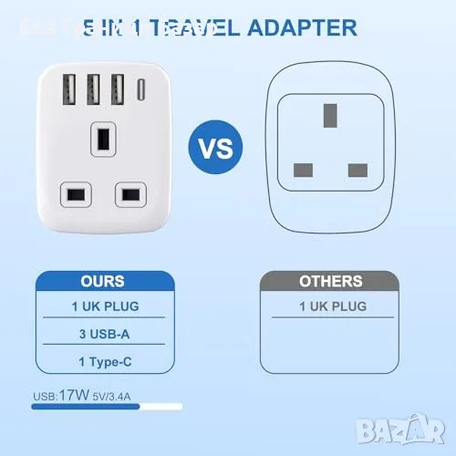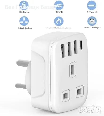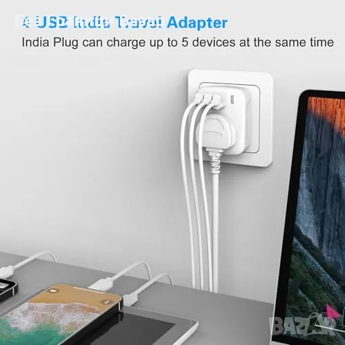 Нов UK към Индия адаптер с 4 USB порта и USB-C, 5 в 1 за пътуване