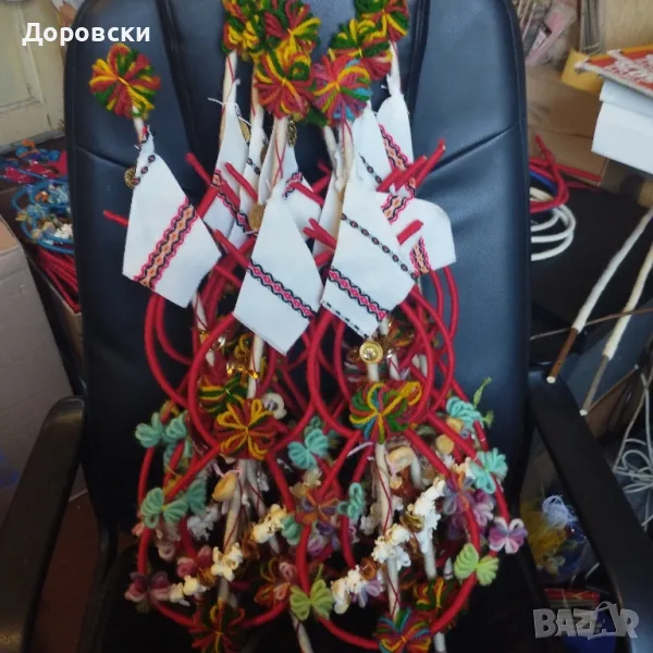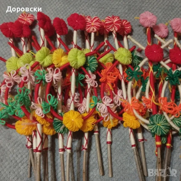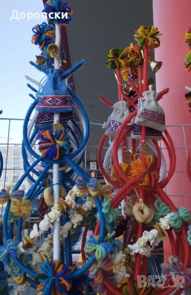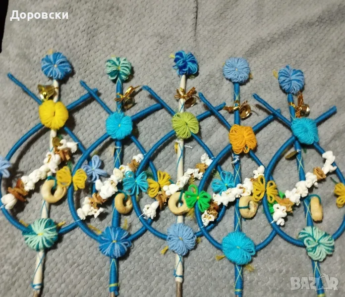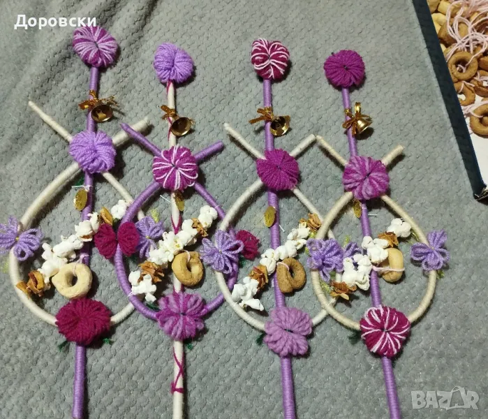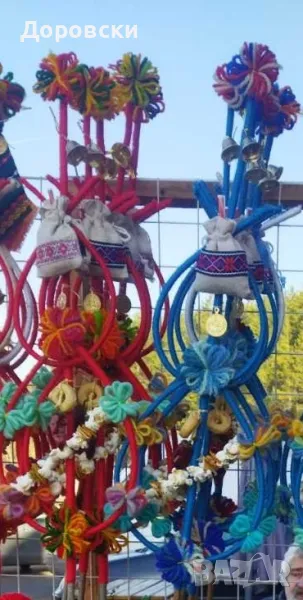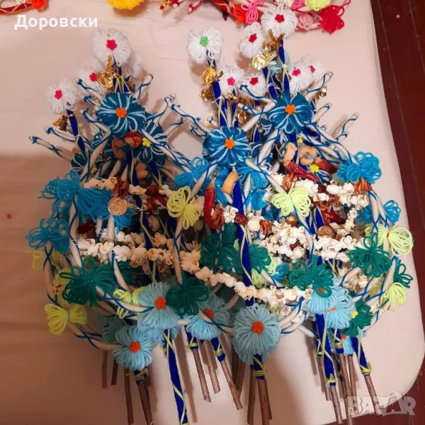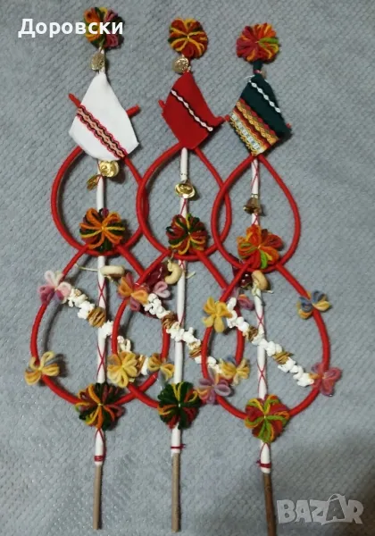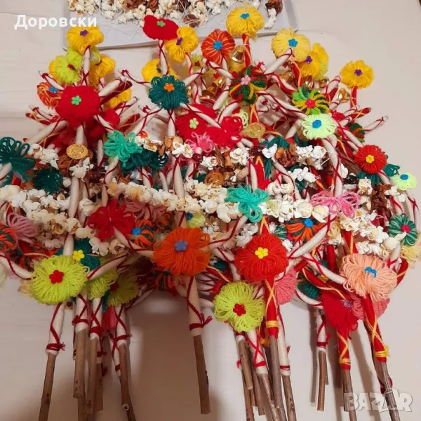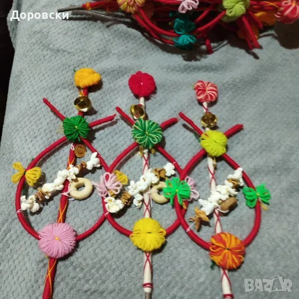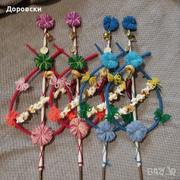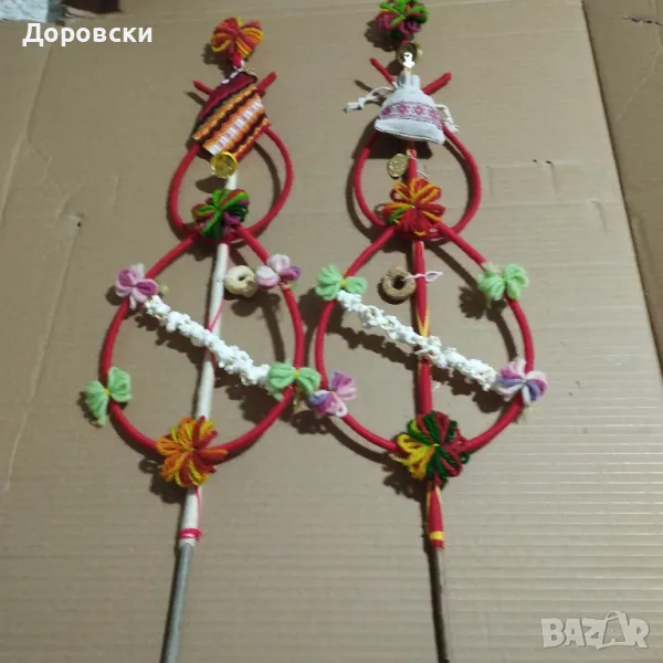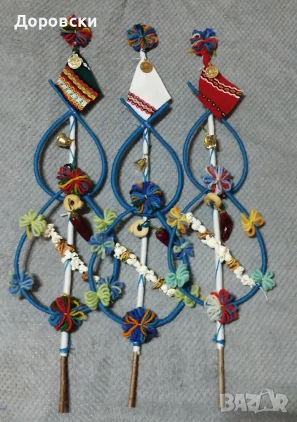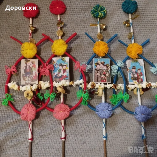 Сурвачки от дрян, украсени с вълнени конци, паричка, камбанка, геврече и паричка.