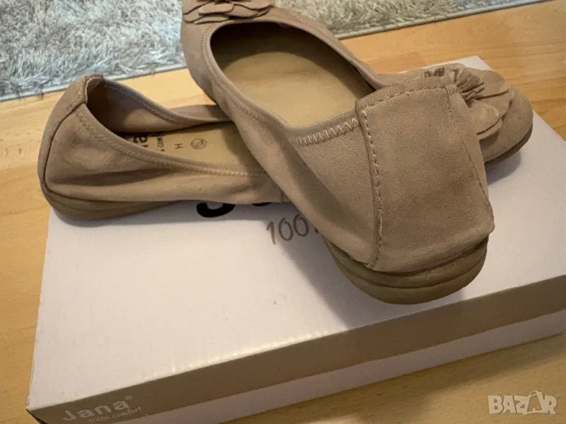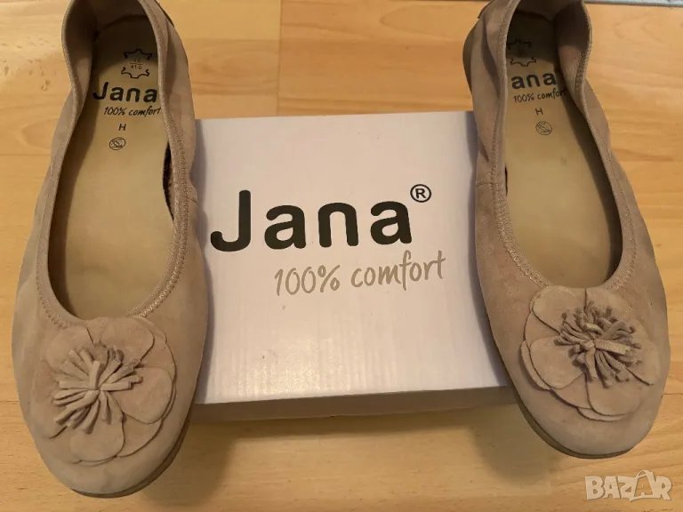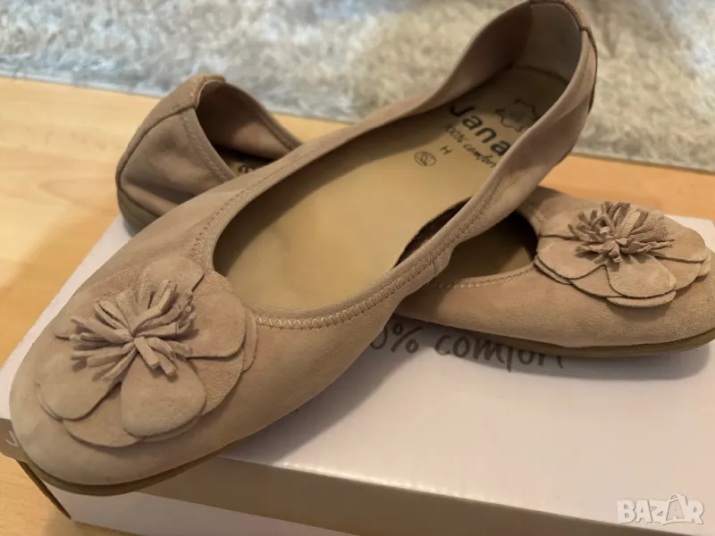 Дамски обувки от естествен велур на немската марка Jana. Телесен цвят, за ходило около 26 см. Супер комфорт, за широк крак, еластична и много меса подметка, прилягат по крака, с красиво и оригинално изработено цвете от естествен велур отпред, универсални -за всеки ден и елегантни за по-официални поводи. В перфектно състояние са, без забележки.
