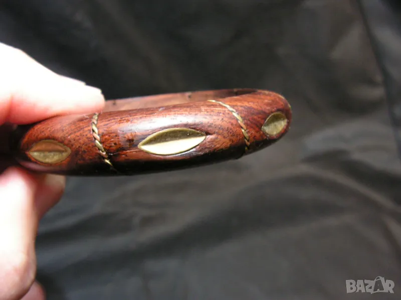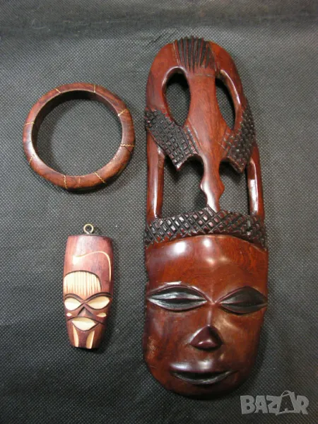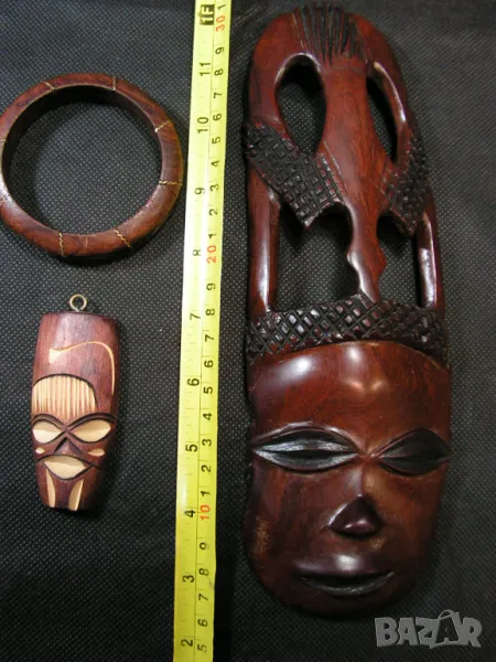 И така продавам комплект от : 3D дарворезба от абанос – женска глава, гривна от абанос с медни вложки. Подарък миниатюра на обредна африканска маска от дърво. Една от снимките е с линия в сантиметри и там се виждат размерите.