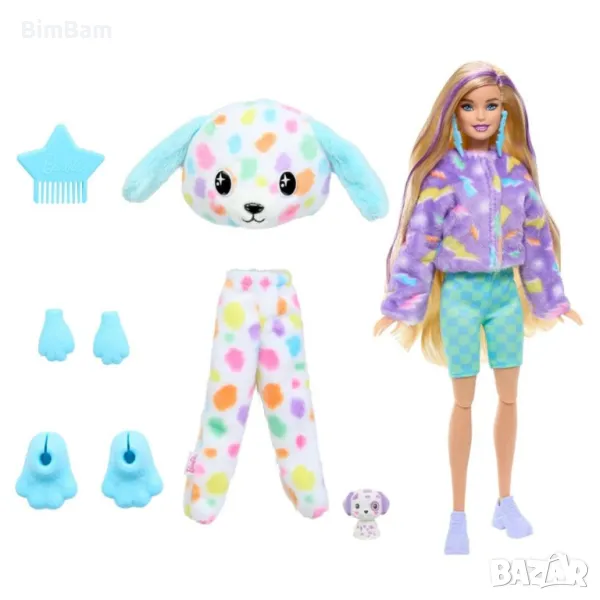Свалете плюшения костюм, за да разкриете кукла Барби с дълга цветна коса. Открийте още изненади, като пола или шорти, чифт обувки, обеци, гребен във формата на звезда и мини домашен любимец. Горната част на плюшения костюм се превръща в поларено яке, а главата на костюма става легло за домашния любимец.