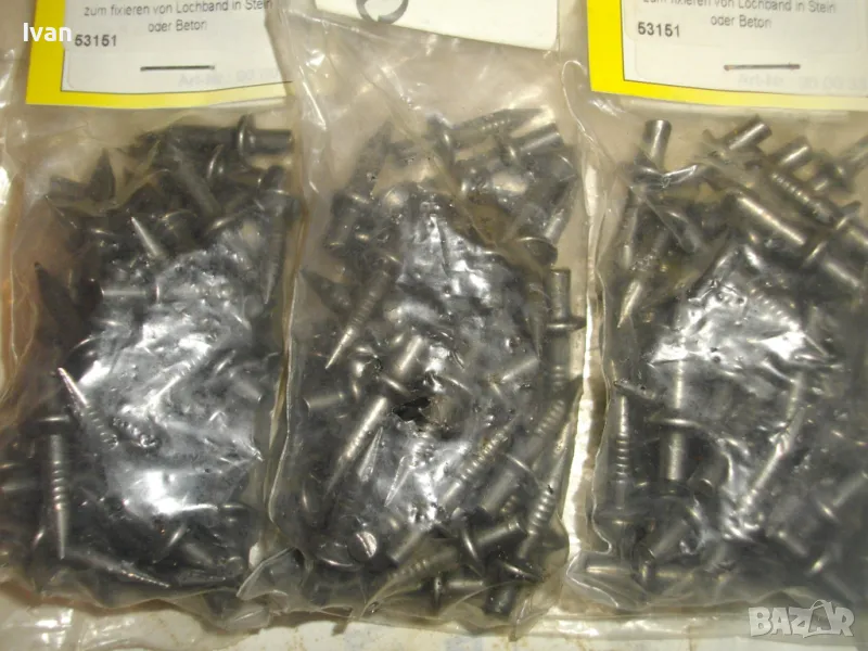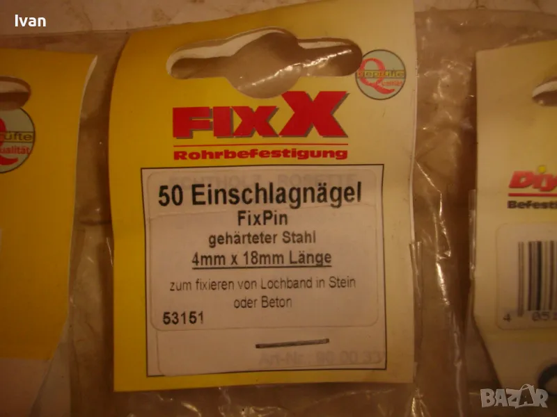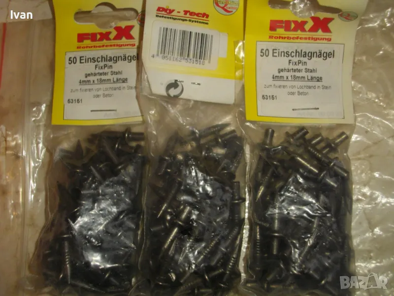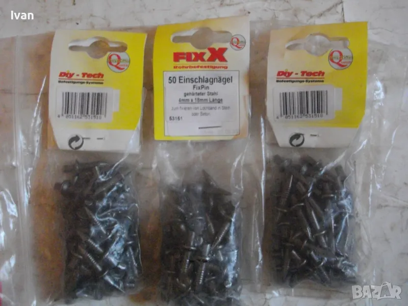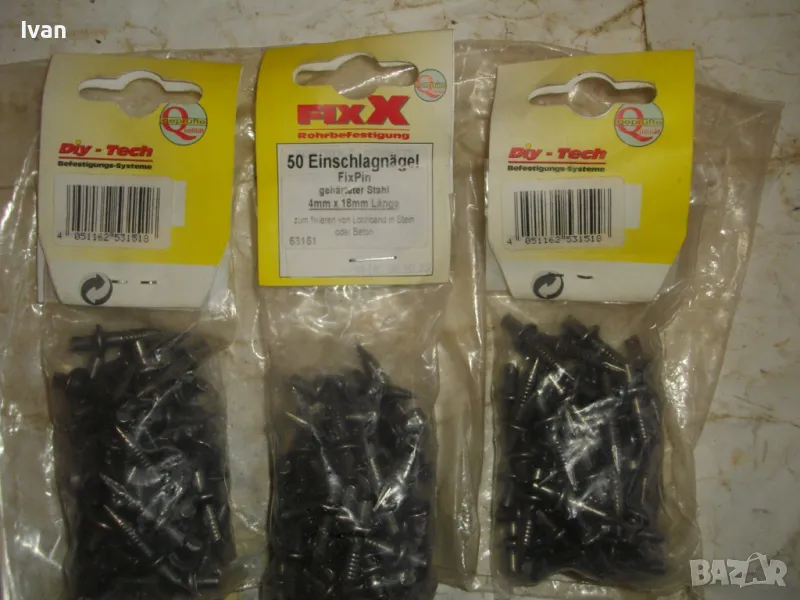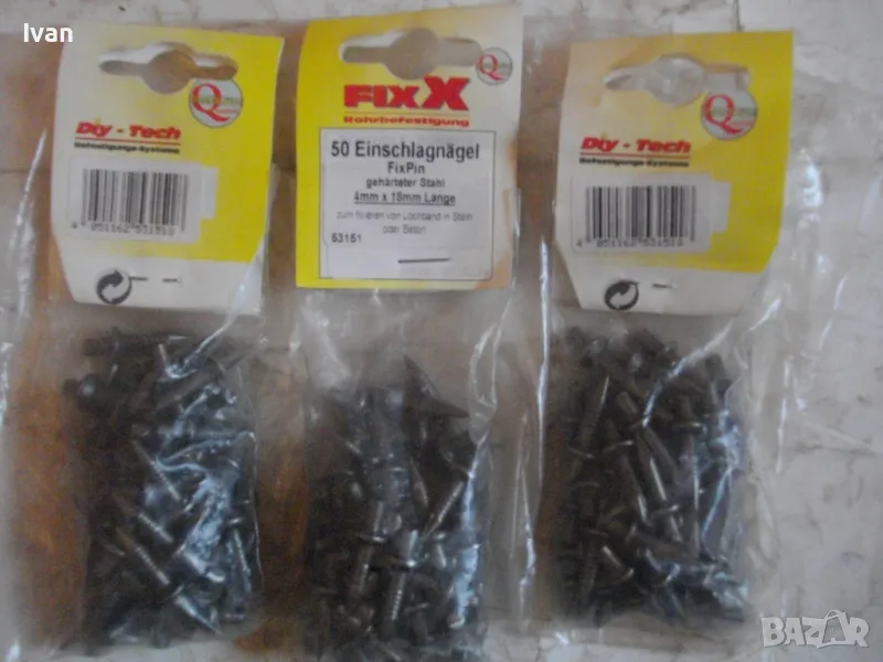 3 пакета нови по 50 бройки всеки с монтажен дюбел пирон размер 4 мм х 18 мм за закрепване на тръби и кабели към бетонови и дървени конструкции. Крепежите са немски оригинални, марка FIX Pin. Geharter Stahl zumfixieren von Loch Band in Stein oder Beton. Производител DAY-TECH. Материал на крепежите - легитирана стомана, оребрени.