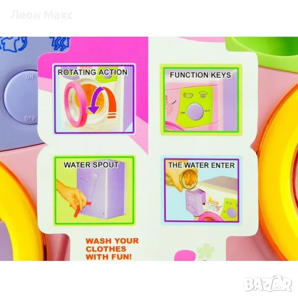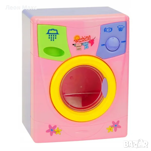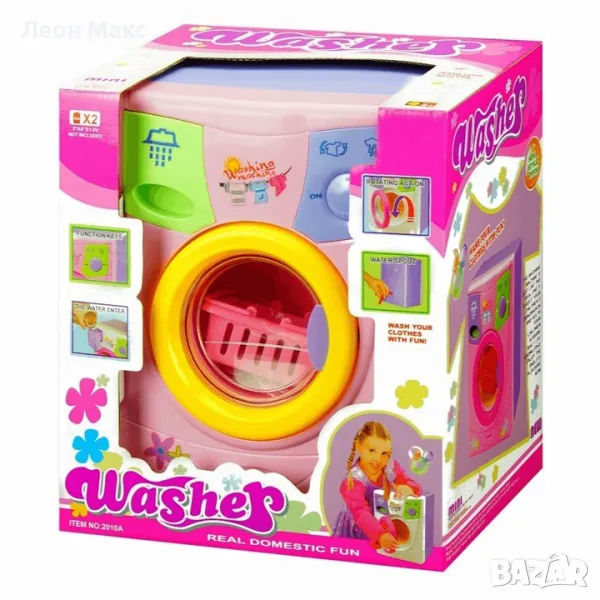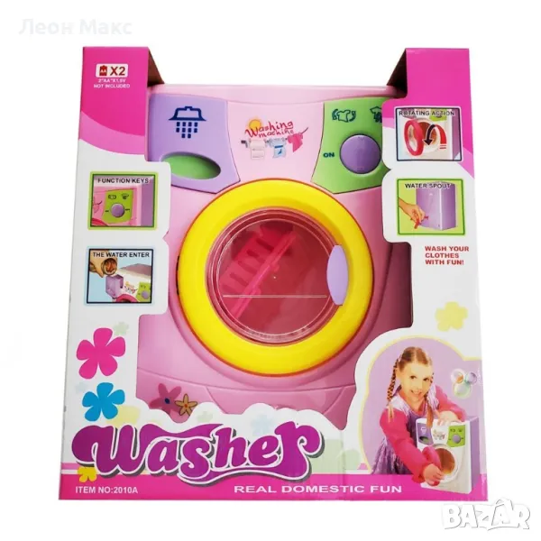 Детската пералня е с функции – вратата на пералнята се отваря, капачето за препарат се отваря и се пуска с бутона ON / OFF, барабана се върти.