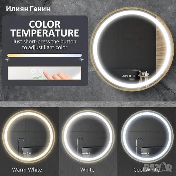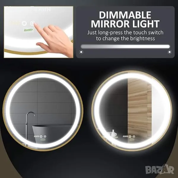 Кръгло LED огледало за баня Kleankin, димируемо осветено с 3 температурни цвята, дисплей за време, функция за запаметяване, кабелно, златно - 250.00лв.