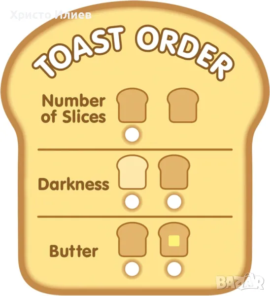 • Поставете дървените филийки хляб в тостера, завъртете селектора, за да зададете интензивността на препичането и натиснете дръжката надолу.