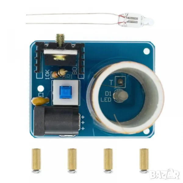 Основен компонент: NPN транзистор BD243, печатна платка с предварително навита основна намотка и всички нужни пасивни елементи.