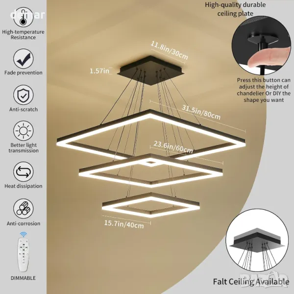 Този модерен пендел, наличен в квадратен дизайн, безпроблемно допълва всеки стил на домашен декор, идеален за пространства като кухни, трапезарии, всекидневни и спални. Той разполага с цветова температура (3000-6500K) и регулируема яркост (0,01%-100%) чрез дистанционно управление, с високо цветопредаване (CRI>80) за подобрено качество на осветлението. Изработен от първокласен алуминий и акрил, той предлага енергийно ефективно, меко осветление и дълъг живот до 50 000 часа. Регулируемият 150 см кабел позволява лесно персонализиране на височината, за да отговаря на различни височини на тавана. Три квадрата - 40 см, 60 см, 80 см.