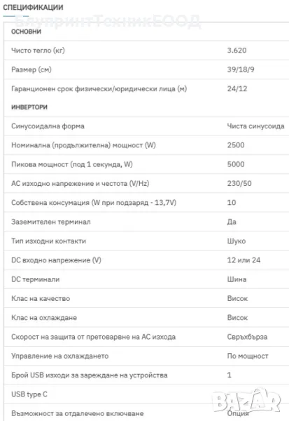 *Пикова мощност: 5000W - налична e за част от секундата! Тя е необходима за стартиране нa някои консуматори при които необходимата мощност за „развъртане“ на електромотора е в пъти по-голяма от нужната след това. За пример хладилник за домашна употреба в повечето случаи изисква стартова (пикова) мощност от около 900 вата а секунда след това продължава да консумира едва 50-90 вата. Такива електроуреди са компресорните хладилници, фризери и климатици които нямат плавен старт, винтовите подемни крикове и т.н