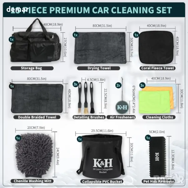 Този цялостен комплект за грижа за автомобила включва ултра-абсорбираща кърпа за сушене с тегло 1200 g/m2 (50 cm x 70 cm) за премахване на вода без следи, универсална двустранна кърпа от 600 g/m2 (40 cm x 60 cm) за сложни зони и стъкло и 400 g/m2 (40 cm x 40 cm) кърпа от коралов полар, идеална за нанасяне и полиране лечения. Той също така разполага с комплект от три почистващи кърпи 280 g/m² (30 см x 40 см) за специализирани задачи: кърпа за вафли за прозорци, кърпа за полиране на стъкло без следи и универсална кърпа от микрофибър. Четките включват четка за косми от глиган за деликатни повърхности, твърда четка за твърда мръсотия и мека външна четка за боядисани повърхности. Шенилната ръкавица за пране осигурява нежно, цялостно почистване, докато сгъваемата PVC кофа предлага удобство и преносимост при миене на автомобили.