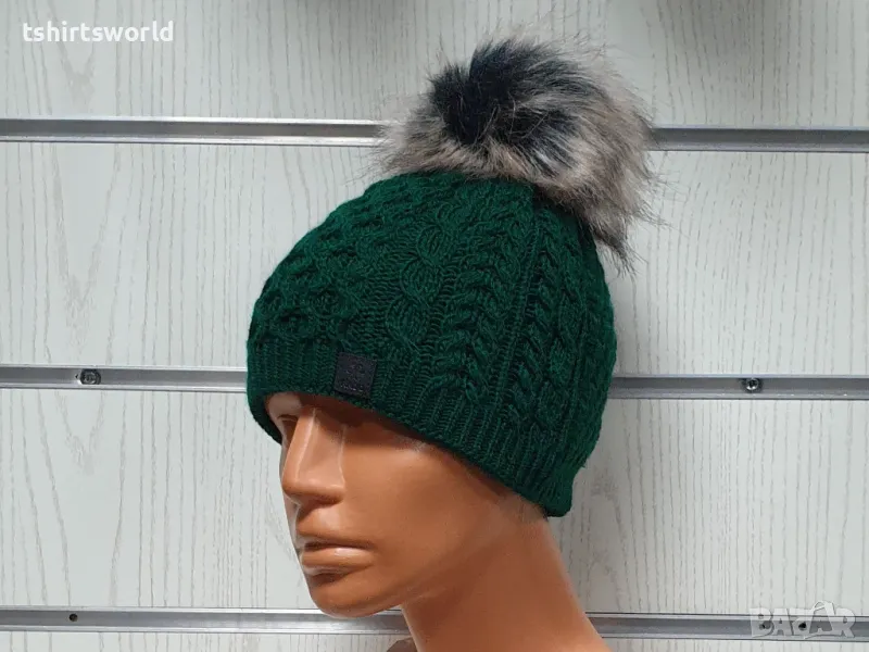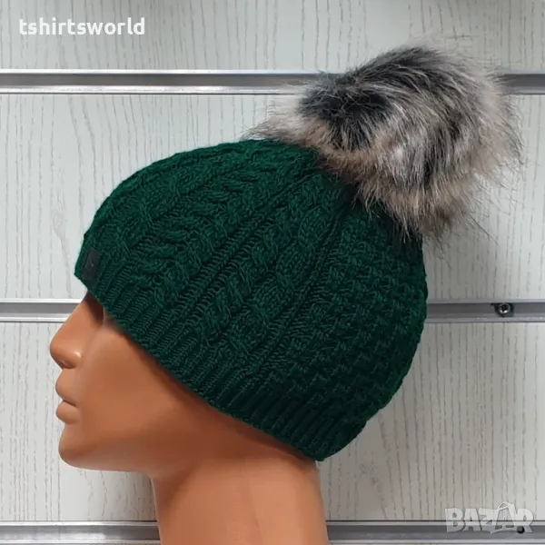 Уникална, функционална, универсална, стилна и модерна нова зимна дамска плетена шапка с помпон/пух в зелен цвят.