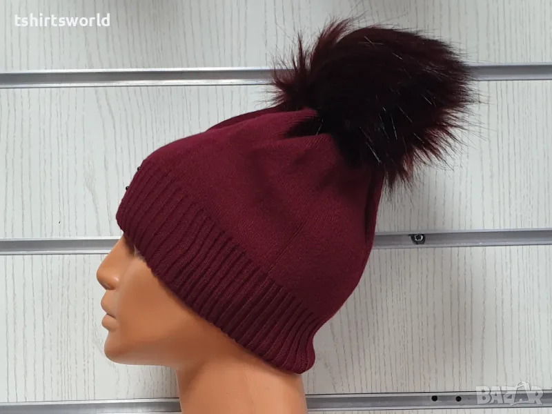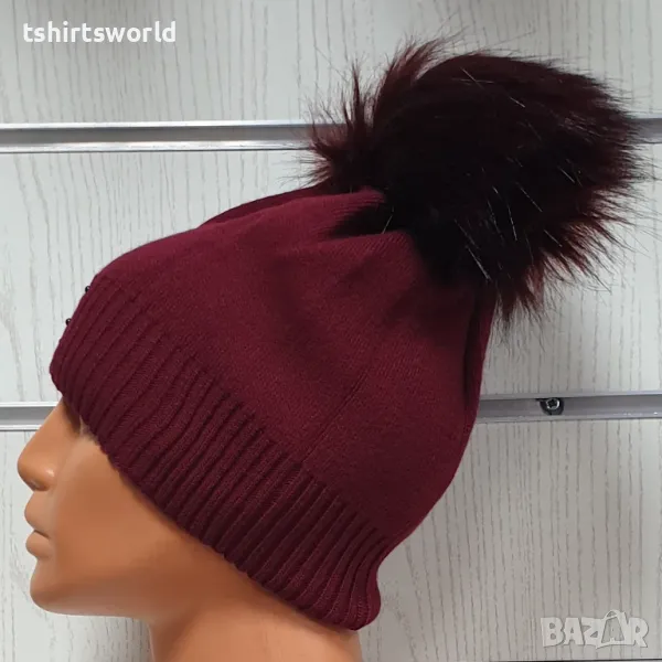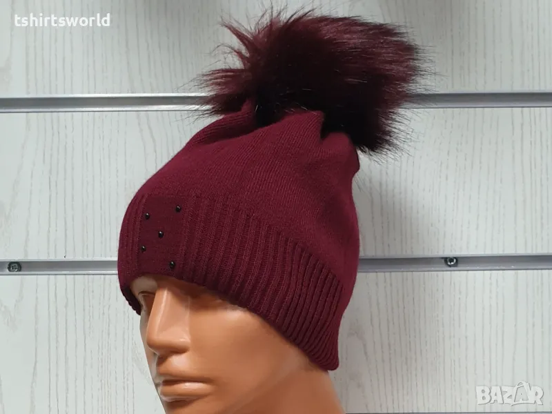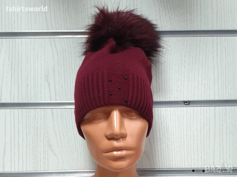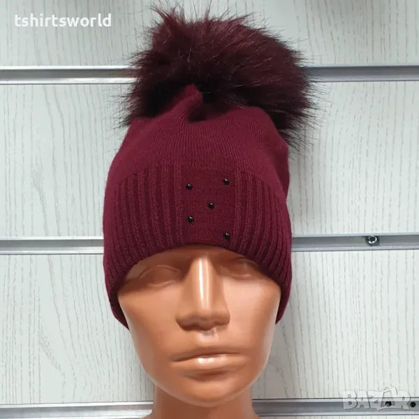 Нова зимна дамска шапка с камъчета с пух/помпон в цвят бордо → Обява 48209315