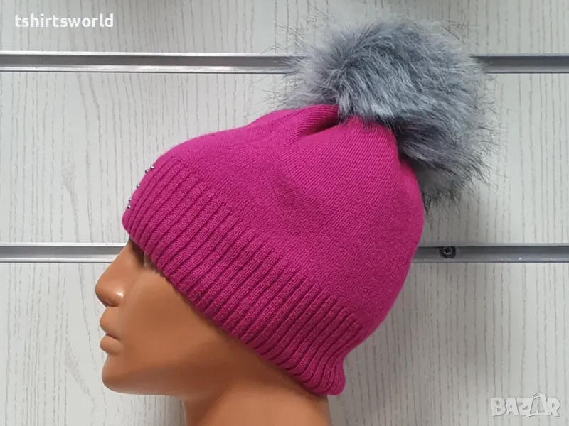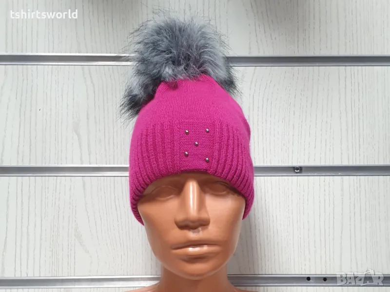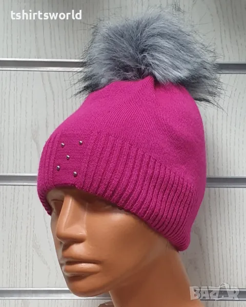 Нова зимна дамска шапка с камъчета с пух/помпон в цвят циклама → Обява 48209580