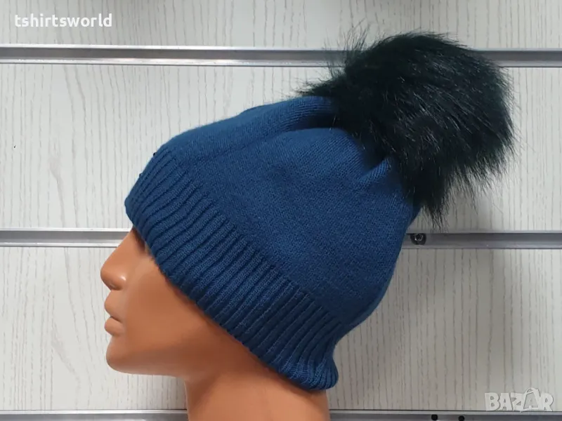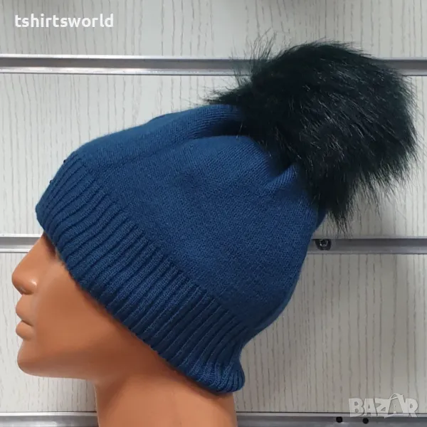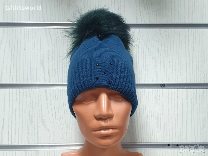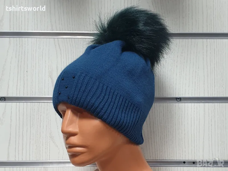 Нова зимна дамска шапка с камъчета с пух/помпон в син цвят → Обява 48209746
