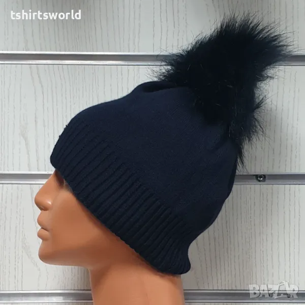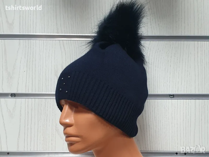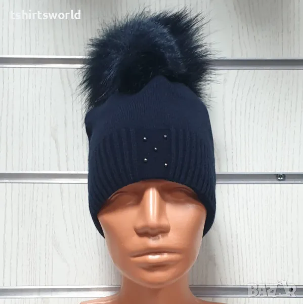 Нова зимна дамска шапка с камъчета с пух/помпон в тъмносин цвят → Обява 48209784