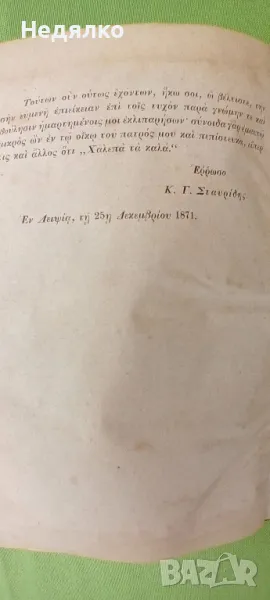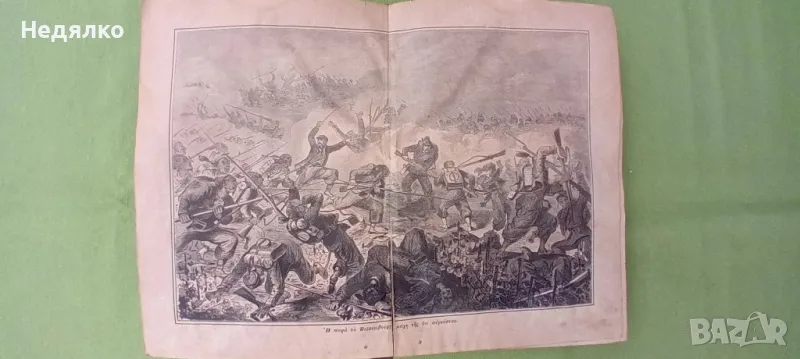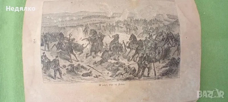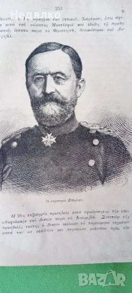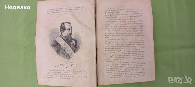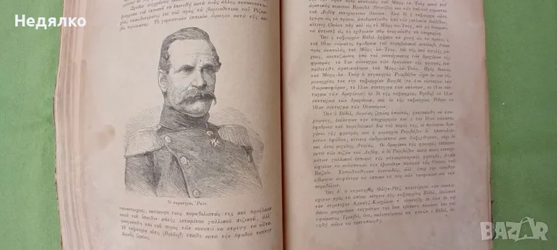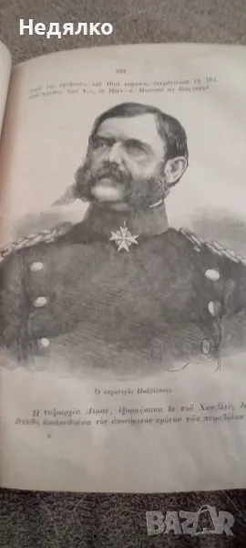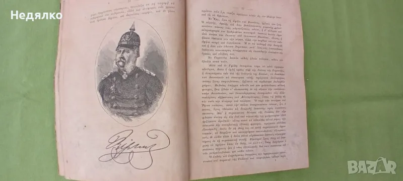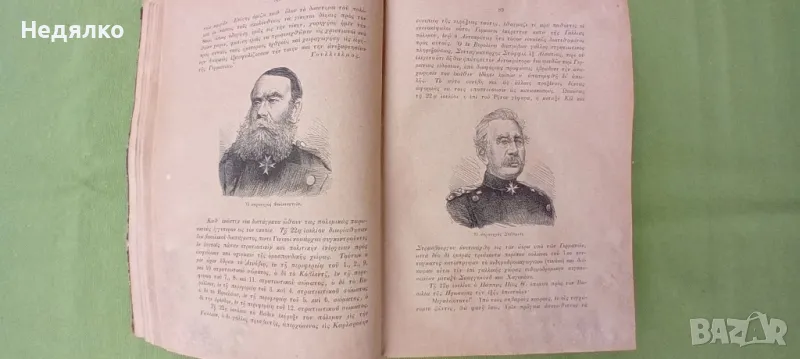 Много рядко оригинално немско издание от Лайпциг на гръцки език,със 149 оригинални литографии на двамата императори с подписите им,Бисмарк и всички генерали,картини от битките при Вердюн,Седан и др.,топографски карти,оръжия и др.615 страници,твърди корици,видяли са малко влага във времето,но са здрави,без липси,скъсано,надраскано или прогнило.