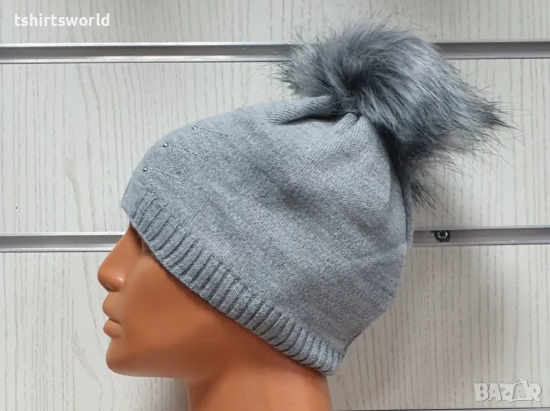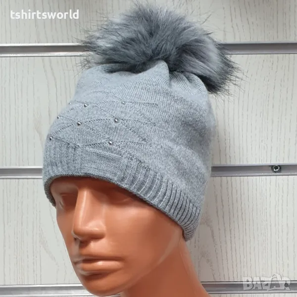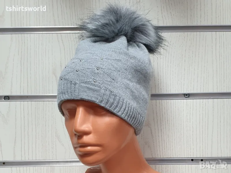 Нова зимна дамска шапка с камъчета отпред и с пух/помпон в светлосив цвят → Обява 48210167