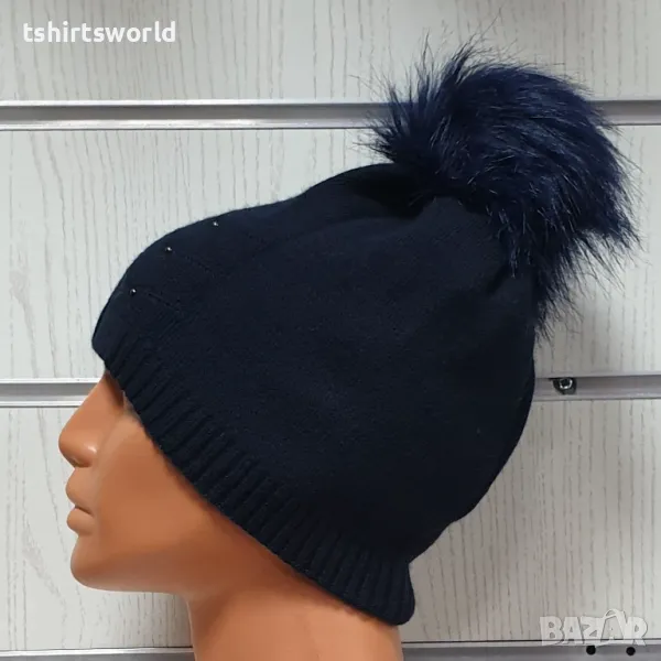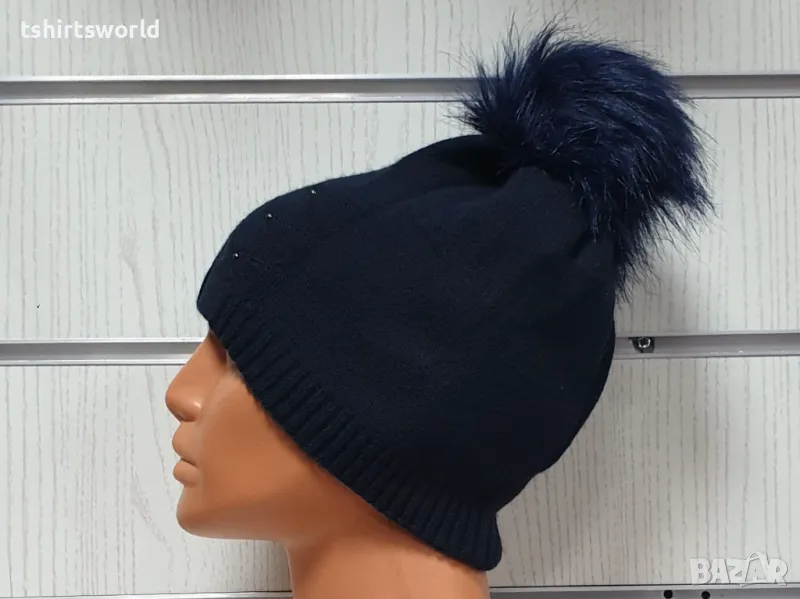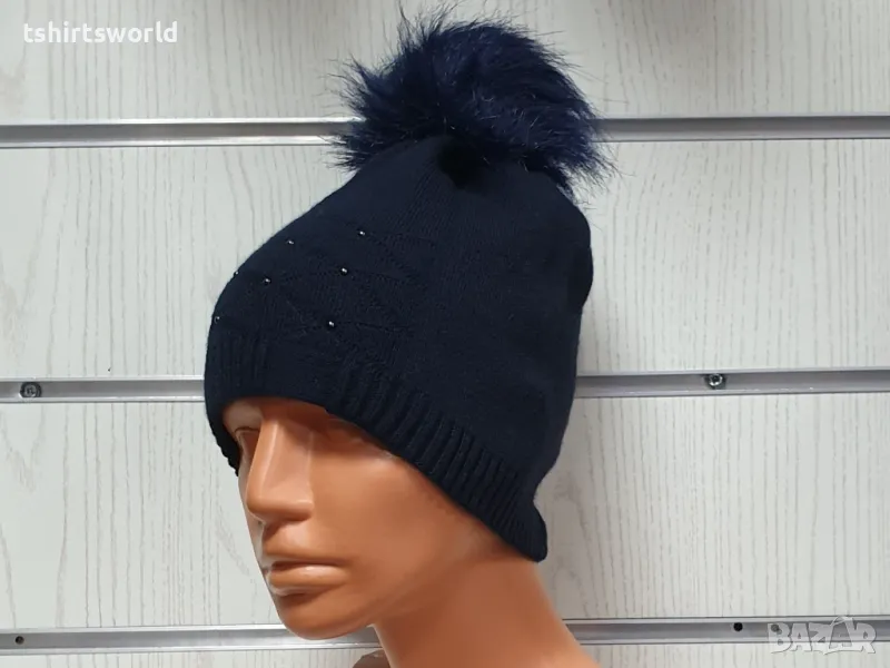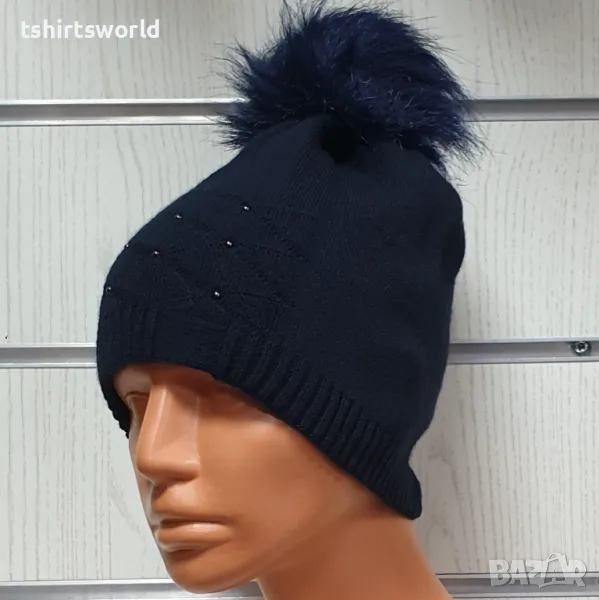 Нова зимна дамска шапка с камъчета отпред и с пух/помпон в тъмносин цвят → Обява 48210237