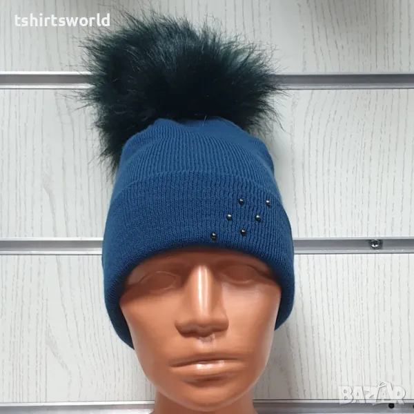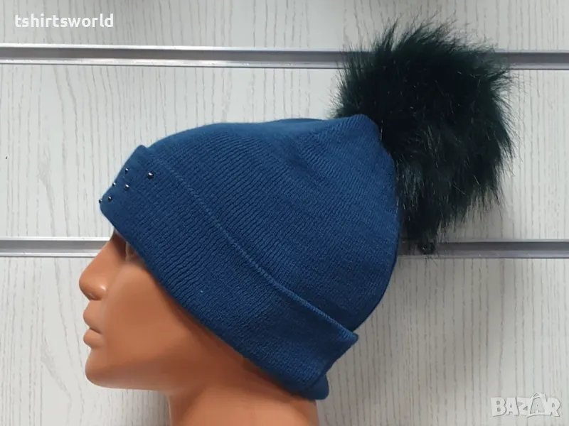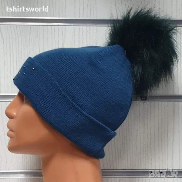 Нова зимна дамска шапка с подгъв и камъчета с пух/помпон → Обява 48210398