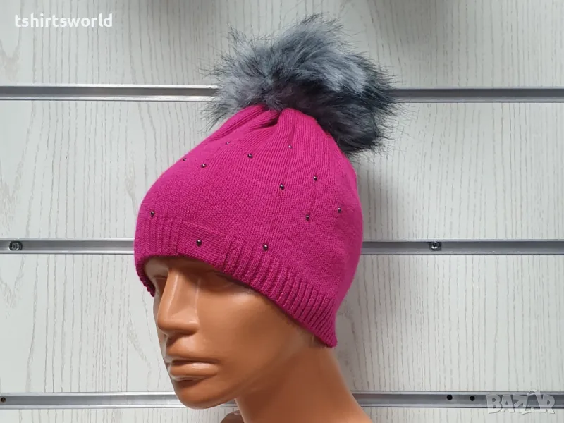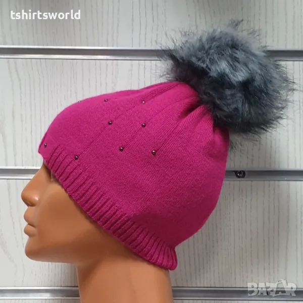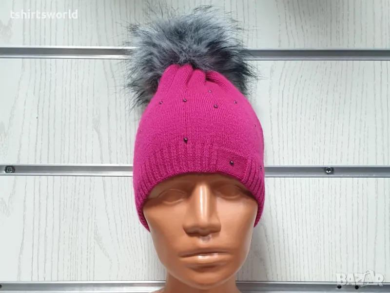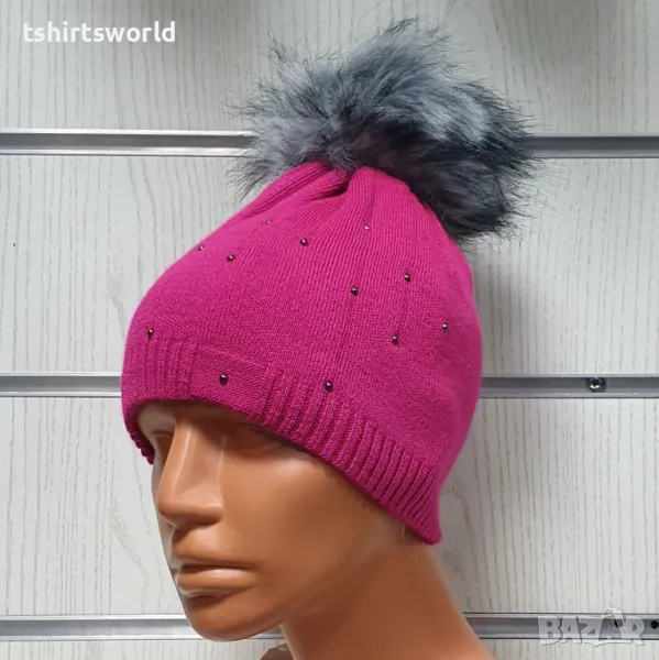Нова зимна дамска шапка покрита с камъчета и с пух в цвят циклама → Обява 48210447