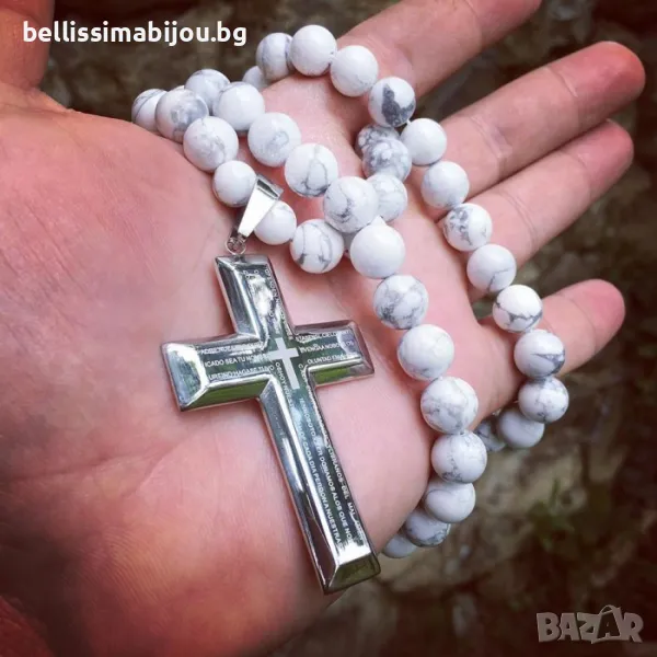 Бял Мъжки Гердан/Колие от Ахат със Стоманен Кръст, снимка 1 - Колиета, медальони, синджири - 48210606 Бял Мъжки Гердан/Колие от Ахат със Стоманен Кръст, снимка 2 - Колиета, медальони, синджири - 48210606 1/2