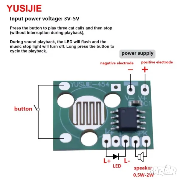Модулът изисква свързване към външен високоговорител с мощност 0.25W до 2W и импеданс 8Ω. Вграденият чип предлага защита от късо съединение и други електронни повреди, което го прави издръжлив и подходящ за DIY ентусиасти и любители. Това е идеалният компонент за създаване на интерактивни играчки за домашни любимци, учебни макети или всякакви проекти, нуждаещи се от прост, но ефективен звуков ефект.