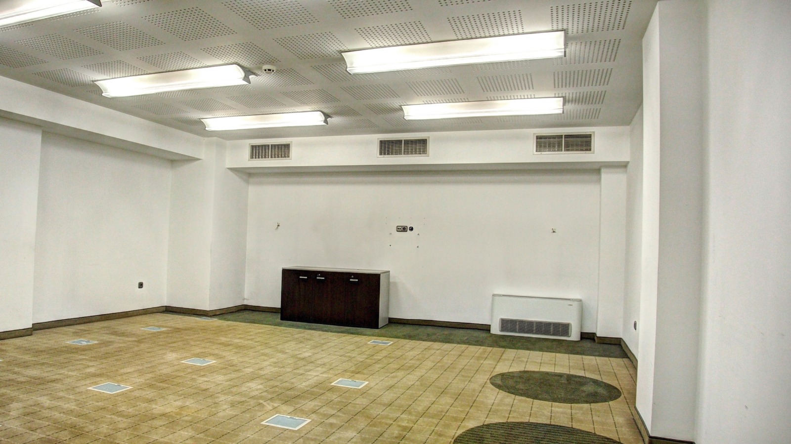 първи етаж - , коридор, фоайе, многофункционална зала с възможност за разделяне чрез мобилни прегради, два санитарни възела, склад
