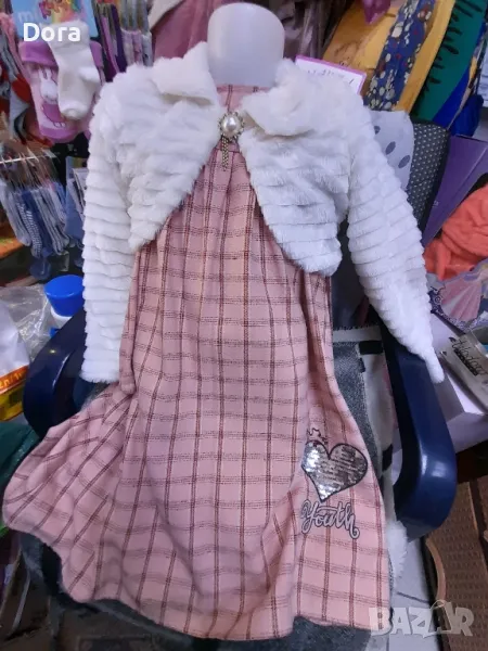 Детска рокля материя бархет с болеро ,бяло мъхеста топла материя.Може и по отделно. да се закупи.Цена 32лв. рокля,болеро 18лв.В тази комбинация е 50лв.Роклята има избродирано сърце в долния край от паети.Може да откриете във Варна в магазина на фирмата на ул.Др.Пискюлиев ном.6.Заповядайте.
