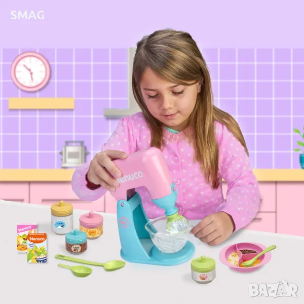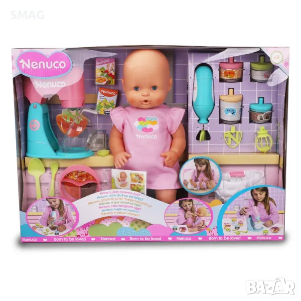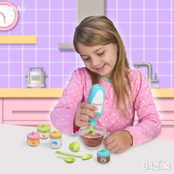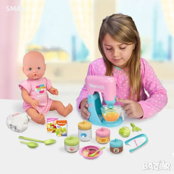 Нежно бебе, което иска вашите грижи! Време е да хапнете Nenuco! Игрален комплект с много различни аксесоари за приготвяне на храна и кукла бебе с височина 42 см. Пригответе храната на Nenuco с миксера. Натиснете бутона, той наистина смесва храната за Nenuco. Миксерът може да се сваля, за да се използва отделно като ръчен миксер. Поставете храната в купата и нахранете Ненуко с нейната лъжица - тя наистина яде! Тогава е време да й смениш памперса! Съхранявайте храната във включените контейнери с капак. Съдържа 15 аксесоара. Работи с 2 батерии AAA (не са включени).