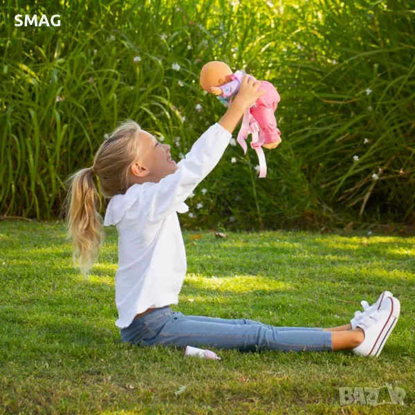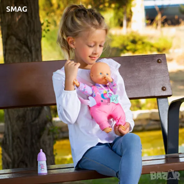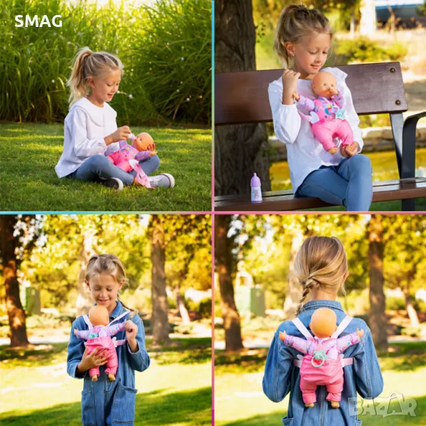 Кукла бебе с меко тяло, височина 30см. Има презрамки като на раница, за да може детето да я носи на гръб или на гърдите и да носи куклата навсякъде със себе си. Съдържа още бутилка и залъгалка. Гърбът на бебешкото боди играе ролята на място за съхранение.
