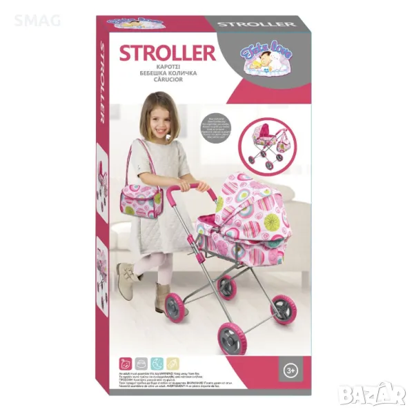 Kоличка за кукла за момиче с кош за новородено с бял плат и розови шарки, големи колела и дръжка в цвят фуксия. Заедно с чантата може да вземете всичко необходимо за бебето. Количката се сгъва за лесно съхранение.