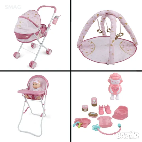 Игрален комплект за кукли с розови дрехи и маска за сън, количка и столче за хранене, постелка за игра заедно с много аксесоари за грижа за бебето. Натиснете малката овца, за да чуете красиви мелодии, а бебето да чуе 10 звука и думи на английски. Работи с 3 батерии тип AG13 (включени).