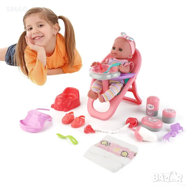 Комплект със седалка за хранене, 35 см кукла с дрехи в лилаво райе и лента за глава с 12 звука. Бебето пишка! Има много аксесоари за грижата си. Работи с 3 батерии тип AG13 (включени).