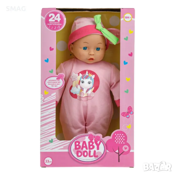 Очарователно бебе с меко тяло, розова залъгалка и 24 звука. Тя носи розови дрехи с принт на еднорог и шапка в същия цвят с лилав лък. Работи с 3 батерии тип 1.5V AG13 (включени).