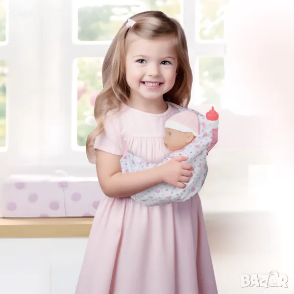 Кукла бебе с меко тяло и розово боди. Ако е гладно може да пие мляко и да си играе с дрънкалката. Но и разходката не може да чака, слагайте бебето в коша и излизайте на разходка!