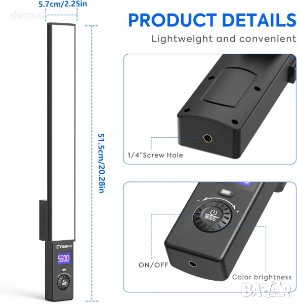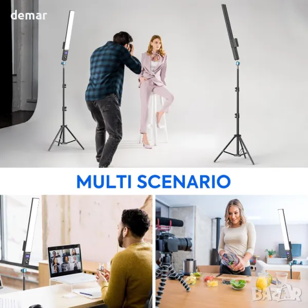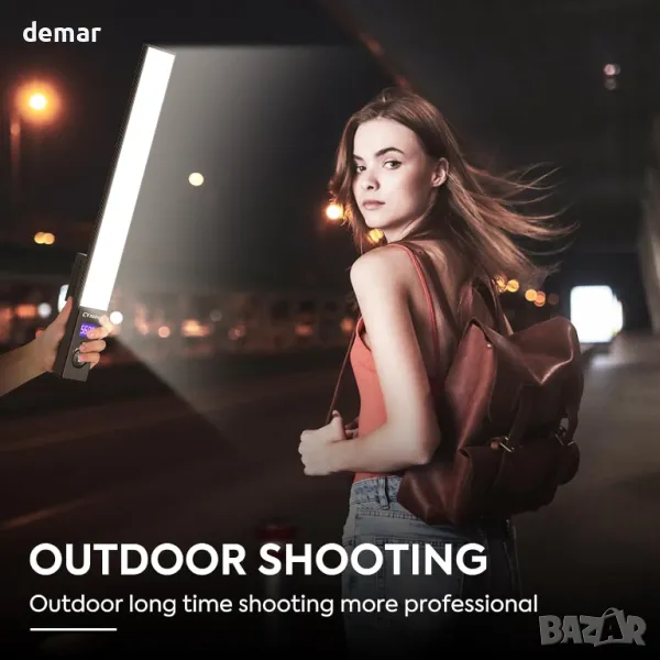 RGB Light Wand разполага с вградена акумулаторна батерия от 6600 mAh, осигуряваща 130 минути работа при пълна мощност, с опция за използване, докато се зарежда. Неговият компактен, лек дизайн включва тънко 1,5 см тяло, което го прави преносим за творческа ръчна употреба. Предлагайки три режима на осветяване (топло, бяло и топло бяло) и 25 RGB ефекта, той е универсален за фотография, видеозаснемане, стрийминг на живо и събития. Оборудван с безжично дистанционно за управление до 15 метра, той поддържа захранване чрез адаптер или включени батерии Sony NP-F970. Пакетът включва статив, дистанционно, кабел за зареждане, батерия, чанта за съхранение и ръководство.