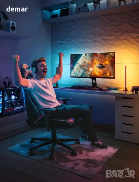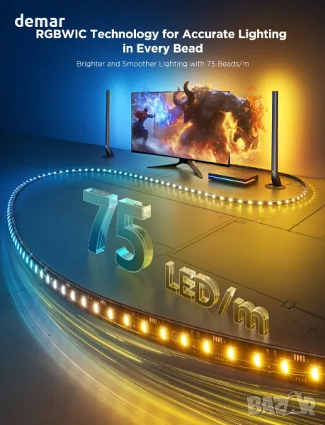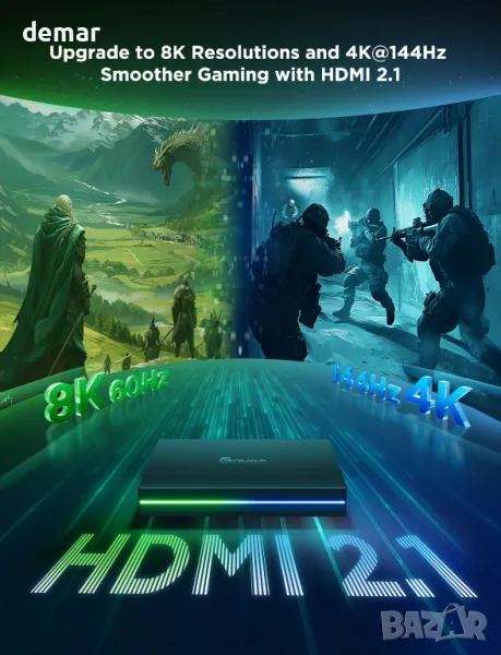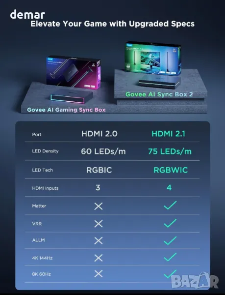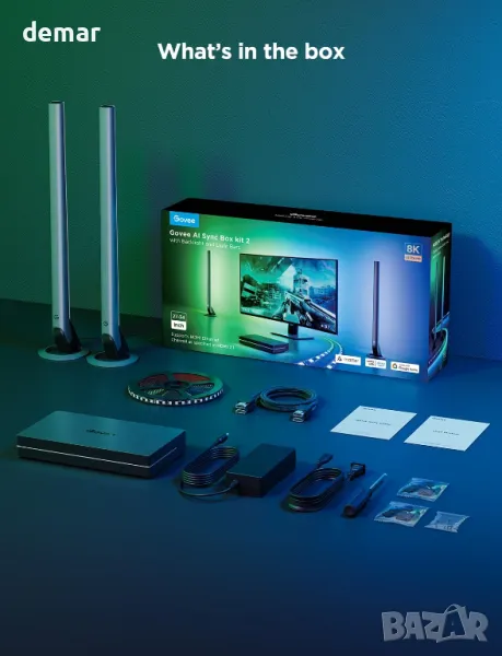 Govee AI Sync Box 2 осигурява безпроблемна синхронизация на екрана и осветлението със своя HDMI 2.1 интерфейс, поддържащ разделителни способности до 8K при 60Hz и 4K при 144Hz, плюс VRR и ALLM за плавни визуализации с ниска латентност. Неговата базирана на AI технология CogniGlow подобрява потапянето чрез динамично регулиране на светлинните ефекти, за да съответства на съдържанието на екрана. Четирицветната LED светлинна лента RGBWIC осигурява живи, прецизни цветове и по-чиста бяла светлина, докато лентата с висока плътност от 75 LED/m предлага изключителна яркост при 450 лумена/m. Той поддържа интелигентни екосистеми с интеграция на Matter за гласов контрол и използва DreamView за синхронизиране на цветовете между устройствата, подобрявайки игрите с Dolby Vision и Atmos съвместимост.