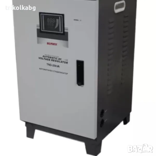 стабилизатори /регулатори/ за ток BULPOWER от ново поколение и мощност 20000 VA, цветен дисплей тип 3 в 1, показаващ волтажа на входящия ток, изходящия ток и моментната консумация /реално натоварване/ на включените в момента ел. уреди.Време за реакция 0 секунди /ZERO CROSS TRANSFER TECHNOLOGY/.Супер лесни за употреба, просто го включвате към мрежата и всичко се настройва автоматично, няма нужда от допълнителни настройки, както на стабилизаторите от по-старо поколение. Предназначението на тези машини е да осигуряват 230 волтово стабилно напрежение, благодарение на което осигуряват стабилна и безопасна работна среда на всички ел уреди, който са чувствителни към резки пикова или спадове в напрежението.Препоръчителни са за използване в специализирани лаборатории, сърварни помещения както и с прецизна медицинска апаратура с висока чувствителност. Автоматично стабилизира входното напрежение в диапазон 150-250V към постоянно и стабилно 230 волтово изходно напрежение.Нашите стабилизатори имат и допълнително 110 волтово изходно напрежение /Американски и Японски стандарт/за да можете да захранвате и машини закупени от Япония и Америка. Идеални са за употреба в региони, където напрежението от електропреносната мрежа е с отклонения и амплитудни колебания, или има смущения от промишлени консуматори (зони в близост до промишлени предприятия, селски райони или вилни зони).Препоръчителна е употребата на стабилизатор и със генератор за ток с цел избягване повреда на скъпи ел уреди и техника.Вградена двойна защита от претоварване, прегряване и късо съединение.При пад на напрежението до 150 V стабилизатора подава постоянно напрежение от 230 V. Стабилизатора предпазва всички ваши ел уреди от изгаряне токови удари и мълнии. Размери Д:41 Ш:41 В:70 см тегло 45 кг.ДВЕ ГОДИНИ ПЪЛНА ГАРАНЦИЯ !!!