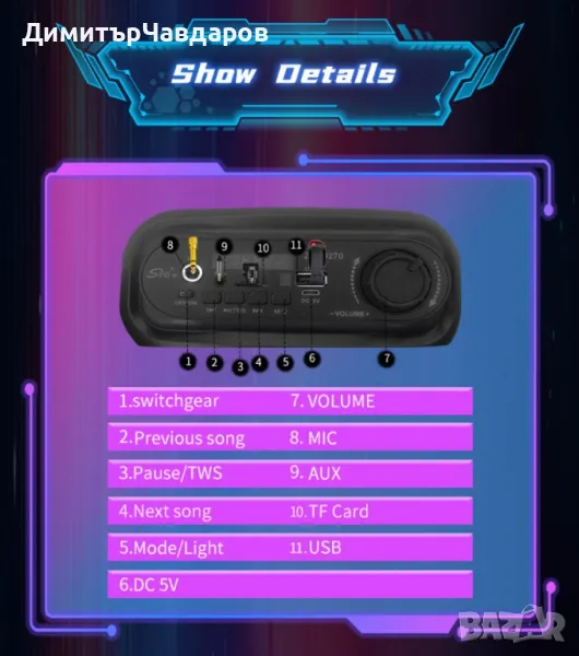 Режими на възпроизвеждане: Bluetooth, FM, TF карти;