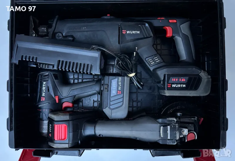 от M-Cube серията в отлично визуално състояние и работят перфектно, внос от Франция. Обявената цена включва акумулаторен саблен трион, ъглошлайф, винтоверт, 3 броя батерии по 18V 5.0Ah с индикатор, бързо зарядно и куфар на Вюрт. Пращаме с преглед и тест с куриерска фирма еконт може и лично предаване за гр. Шумен.Магазинската цена на сета е: 2 977лв.