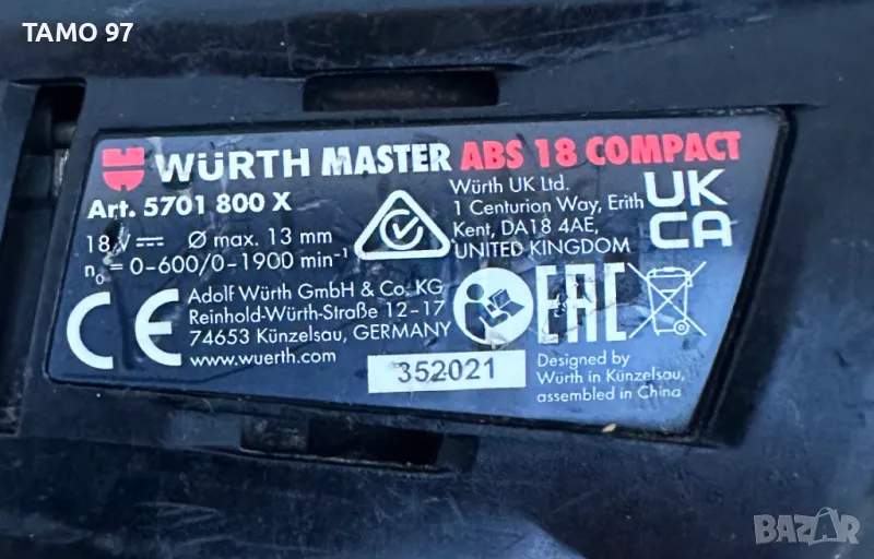 3. Безчетков винтоверт: Wurth ABS 18 Power