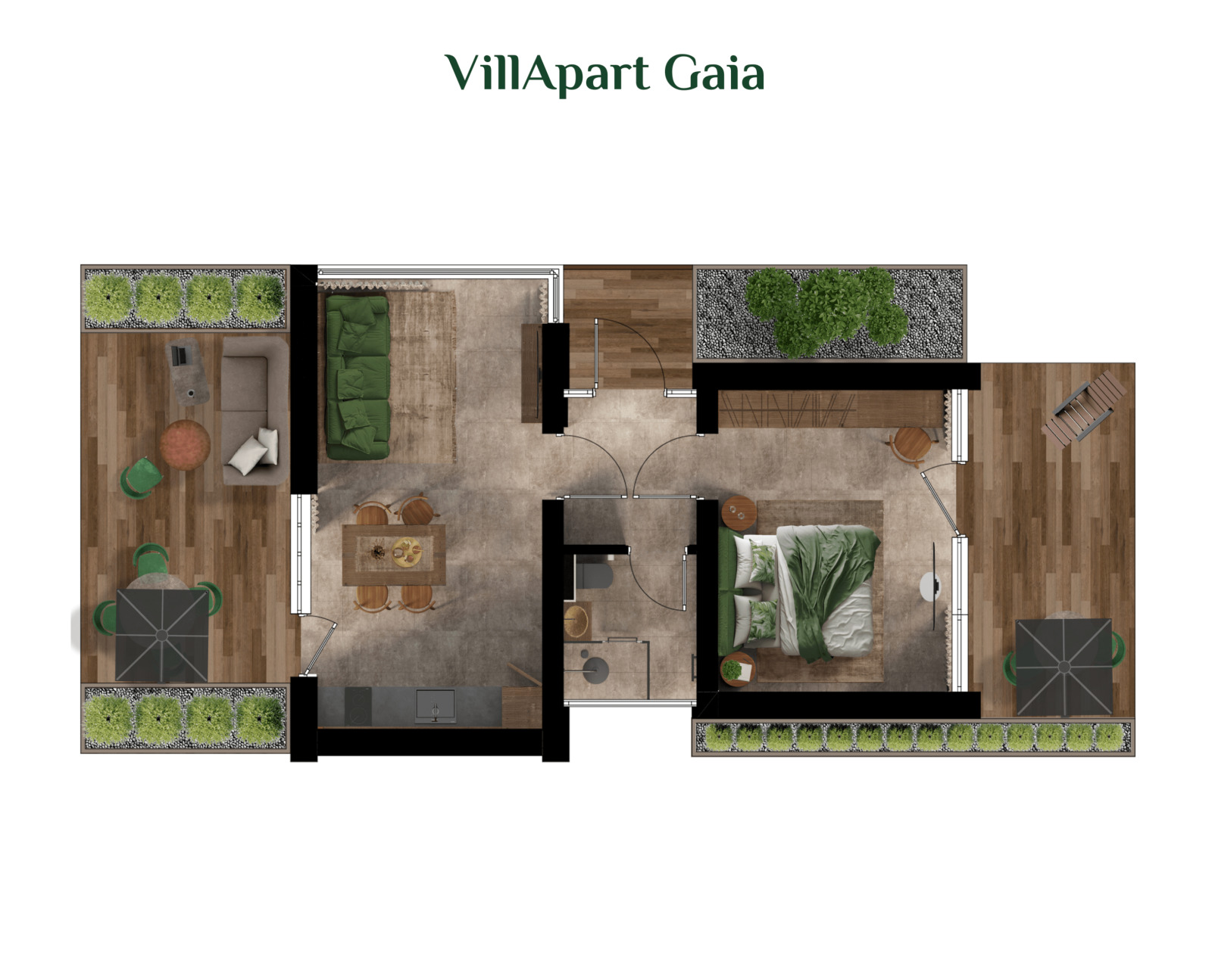 Разположена е в две зони на Arcanum: Lake Area около езеро с водопад и Relax Area до два плувни басейна. 33-те вили във VillApart Gaia ще бъдат истинско откритие за тези, които ценят уединението и лукса. Пространството вътре е обмислено до най-малкия детайл - висококачествени авторски довършителни работи, с използването на най-добрите материали и уреди. Френските панорамни прозорци, с излаз на две тераси, ще ви позволят да се наслаждавате на околния горски пейзаж. До къщите ще има паркинг за гости за 50 автомобила. Близостта до СПА център, с басейн и фитнес център, ще създаде идеални условия за релакс и поддържане на отлична форма. А близкият въжен парк за деца ще добави ярки впечатления към всеки ден.