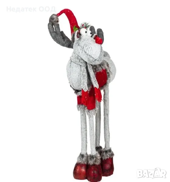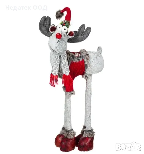Коледна декоративна фигура на елен с високи крака, сиво тяло, червен костюм със златни копчета и сив плетен шал. Може да стои на входа на къщата или до прозореца, допълвайки празничната атмосфера! Вълшебният свят на Коледа оживява!