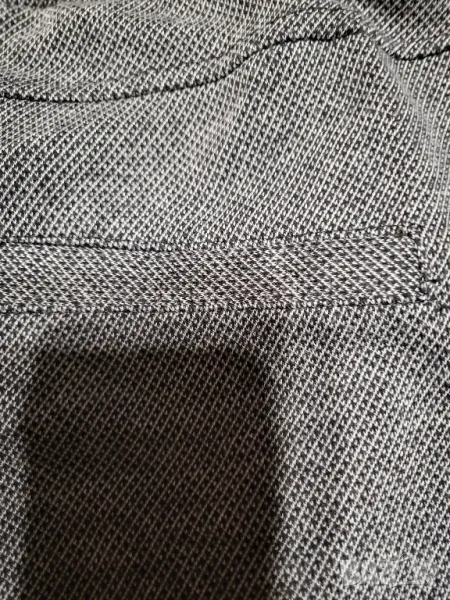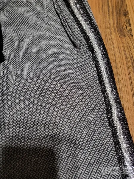 Прекрасен спортен панталон от пепитено сиво трико със сребристо-черен кант отстрани. Има 2 джоба отпред и един имитация отзад.