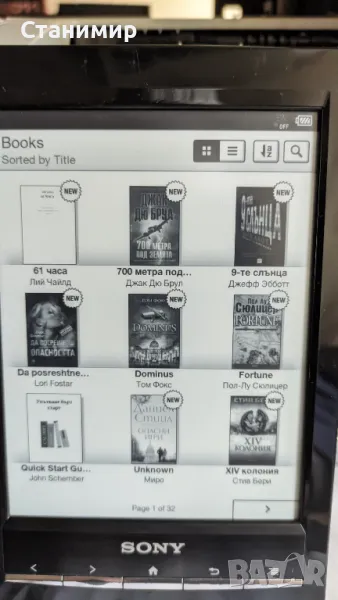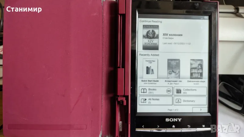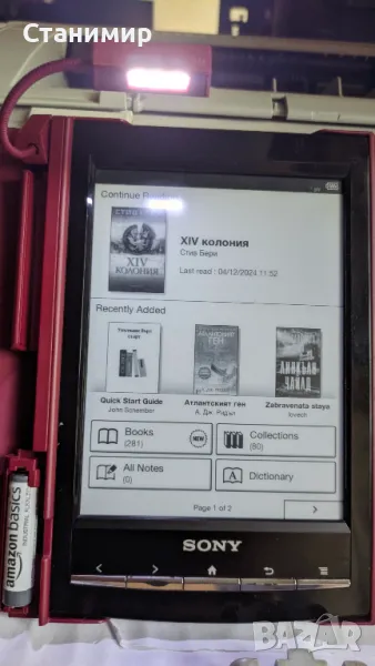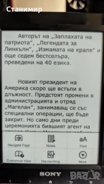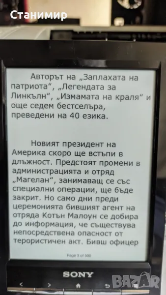 Продавам електронна книга Sony. Книгата е с отличен екран, има бутони, но работи и с тъч скрийн. В четеца са качени над 200 книги предимно трилъри, по ваше желание може да ви кача каквото поискате. С едно зареждане могат да се прочетат около 350-400 страници, което означава, че с едно зареждане може да прочетете една книга, без значение колко време ще ви отнеме това.