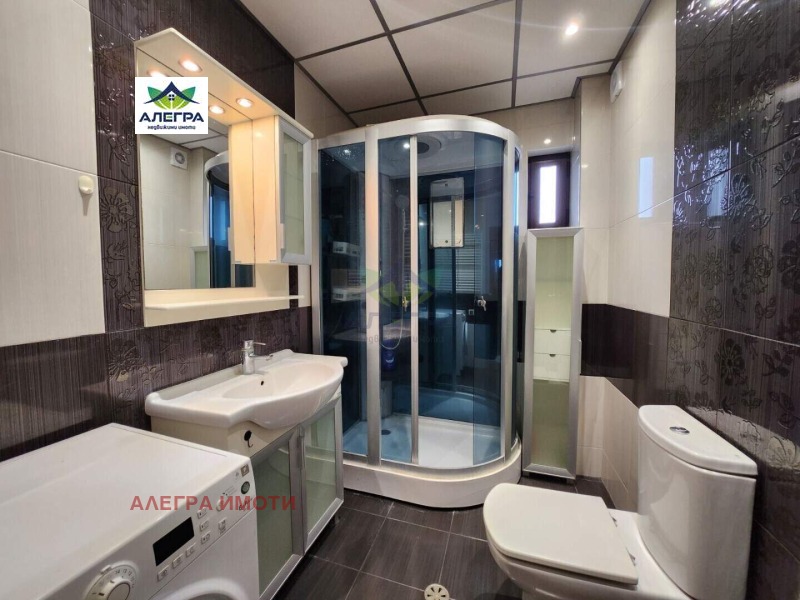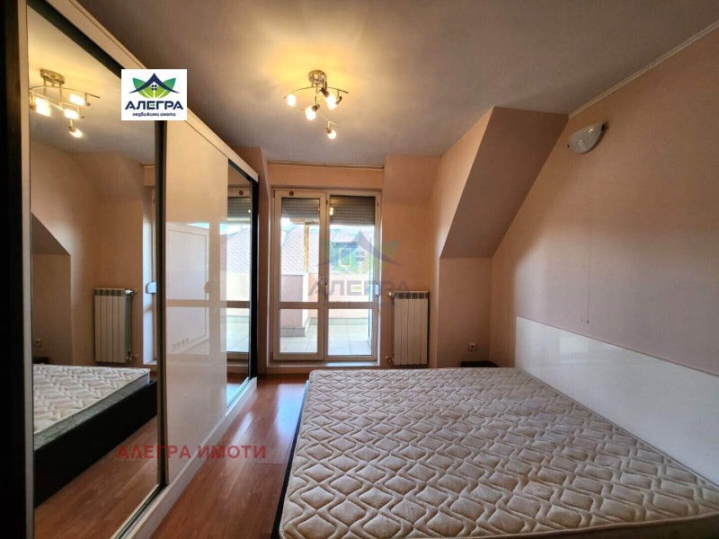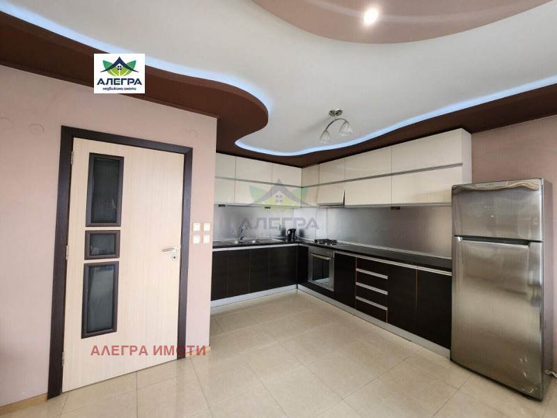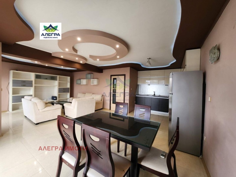 Алегра Имоти предлага на Вашето внимание тристаен обзаведен апартамент в центъра на Пазарджик, в близост до Ескулап. Апартаментът е с площ от 135,09 кв.м. (108,10 кв.м. чиста площ) и се състои от коридор, всекидневна с кухня, трапезария и тераса, две спални (една, от които с тераса) и баня с тоалетна. Към апартамента има и складово помещение (на партера) с площ от 3,63 кв.м.