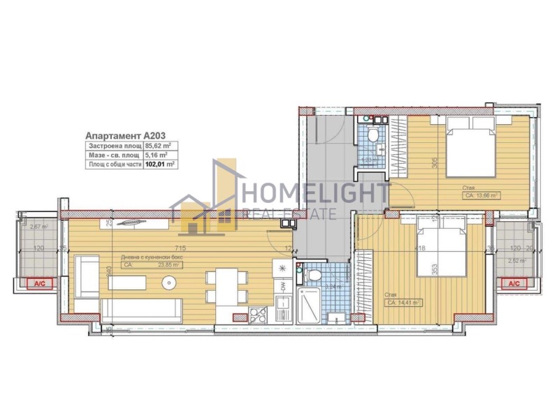 Апартамент А203 е разположен на 2-ри етаж, с изложение изток. Площта му е 102 кв.м. кв.м., като чистата застроена площ е 85,62 кв.м. функционално разпределени във входно антре, дневна с кухненски бокс, две спални, баня с тоалетна, отделна тоалетна и две тераси.