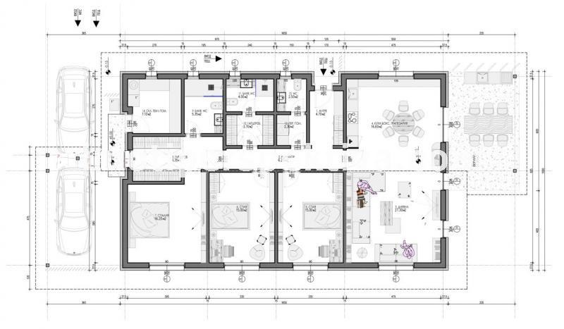 Втората и третата спалня, всяка с площ 15.00 м², разполагат със собствена обща гардеробна от 3.7 м², която предоставя достатъчно място за съхранение на личните вещи. Спалните имат достъп до отделна обща баня, която е удобно разположена, така че да обслужва двете стаи, осигурявайки удобство и практичност. Покрит гараж и паркоместа: Къщата разполага с покрит гараж с площ 36.00 м², който предлага пространство за два автомобила, и допълнителен навес за паркиране с площ 19.40 м².