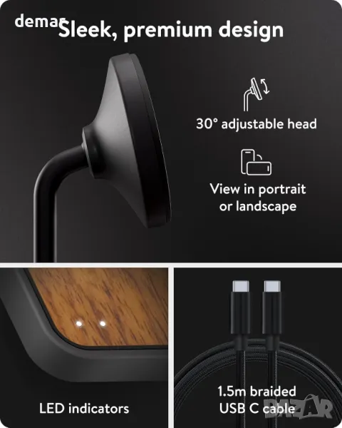 Насладете се на ултрабързо 15W безжично зареждане за устройства с Qi2 или MagSafe, с два пъти по-висока скорост от стандартните зарядни устройства и съвместимост с устройства като AirPods. Сертифицираната технология Qi2 осигурява сигурна магнитна връзка, докато радиаторът предотвратява прегряване за постоянна производителност. Разполага с регулируема повдигната глава за оптимални ъгли на гледане в портрет или пейзаж, идеален за режим на нощно шкафче. Светодиодните индикатори осигуряват състояние на зареждане, а за работа е необходим захранващ адаптер от 30 W (не е включен).