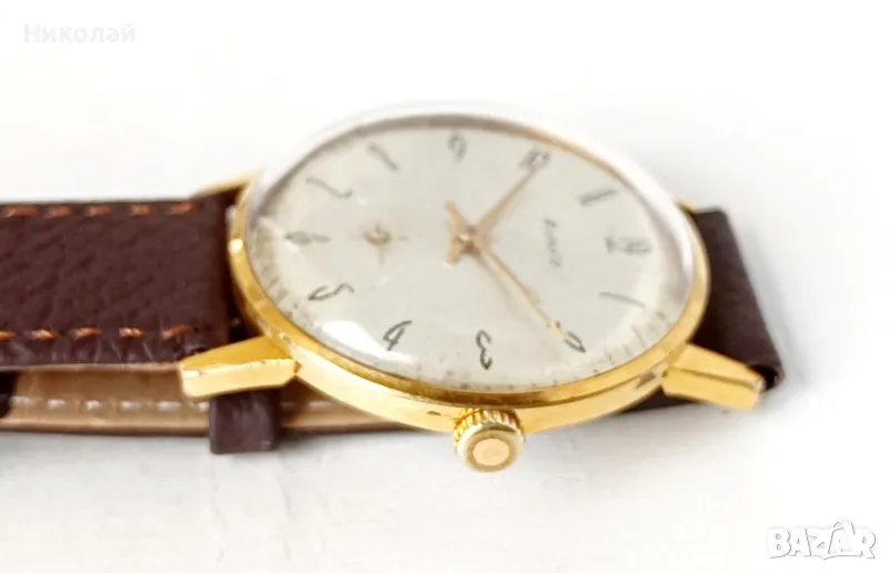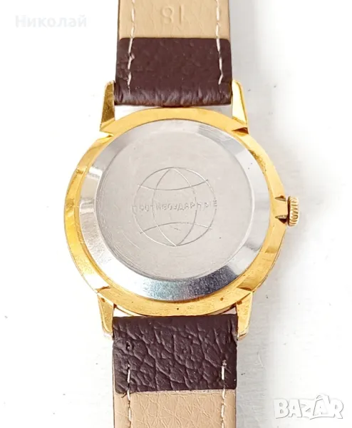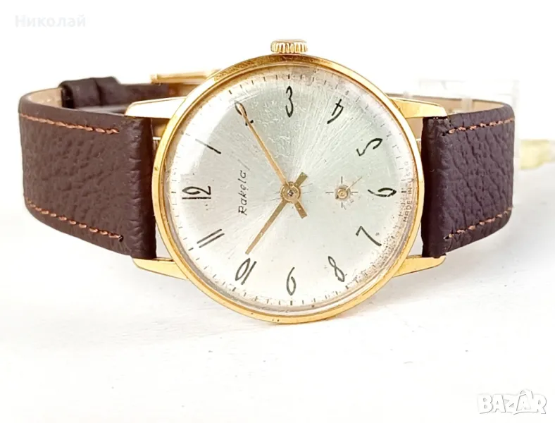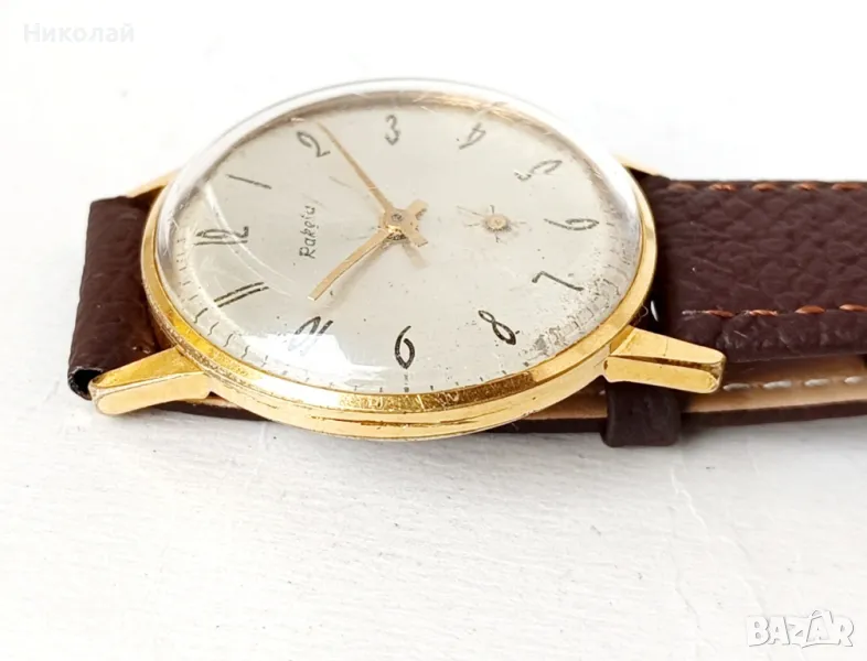 Мъжки часовник Raketa произведен през 60 -те от Петродворцовый часовой завод. ПРОФИЛАКТИРАН. Позлатена каса, с размер 36 мм., с нова кожена каишка.